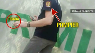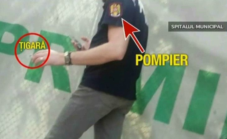 Credeti ca ati vazut tot? Nici pe departe! Priviti-l pe acest pompier! Este in curtea Spitalului Municipal din Bucuresti. Cu o tigara aprinsa, cu telefonul la ureche se indreapta spre usile institutitiei spitalicesti. Ne intrebam daca le va raporta superiorilor incidentul si isi va aplica singur amenda…