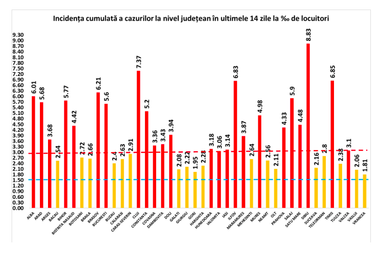Distribuţia pe judeţe a cazurilor de COVID-19 nou înregistrate în ultimele 24 de ore este următoarea: