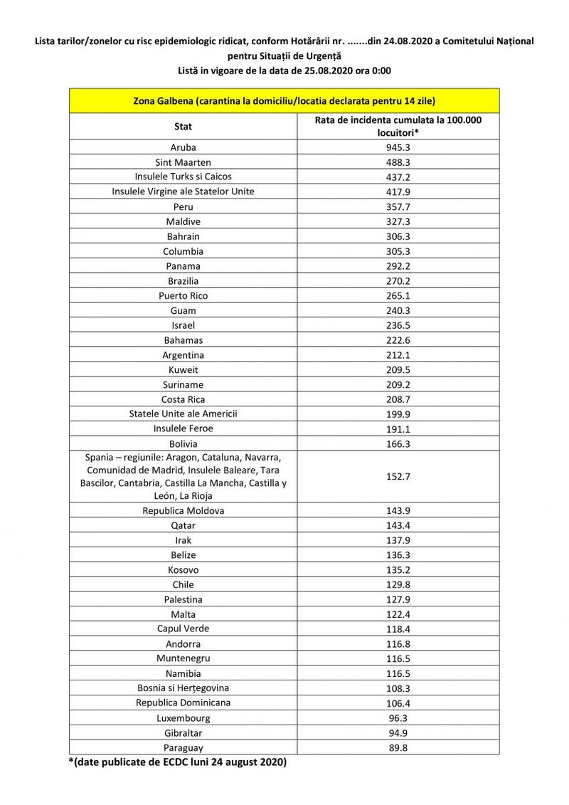 Potrivit anexei la Hotărârea 43 a CNSU, lista actualizată ţărilor şi zonelor cu risc epidemiologic ridicat este următoarea: Aruba, Sint Maarten, Insulele Turks şi Caicos, Insulele Virgine ale Statelor Unite, Peru, Maldive, Bahrain, Columbia, Panama, Brazilia, Puerto Rico, Guam, Israel, Bahamas, Argentina, Kuweit, Suriname, Costa Rica, Statele Unite ale Americii, Insulele Feroe, Bolivia, Spania (regiunile: Aragon, Cataluna, Navarra, Comunidad de Madrid, Insulele Baleare, Ţara Bascilor, Cantabria, Castilla La Mancha, Castilla y León, La Rioja), Republica Moldova, Qatar, Irak, Belize, Kosovo, Chile, Palestina, Malta, Capul Verde, Andorra, Muntenegru, Namibia, Bosnia şi Herţegovina, Republica Dominicană, Luxembourg, Gibraltar, Paraguay.