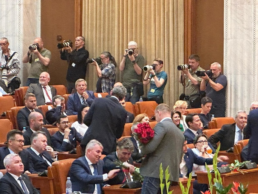 UPDATE - La momentul începerii discursului lui Ciolacu, parlamentarii din Forţa Dreptei, inclusiv liderul partidului, fostul premier Ludovic Orban, au distribuit câte 3 trandafiri roşii şi câte un formular de Adeziune la PSD parlamentarilor din Partidul Naţional Liberal.