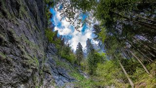 La baza unui perete stâncos ce se îndreaptă aproape vertical către cer, apa care a intrat circa 2.5
