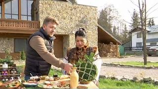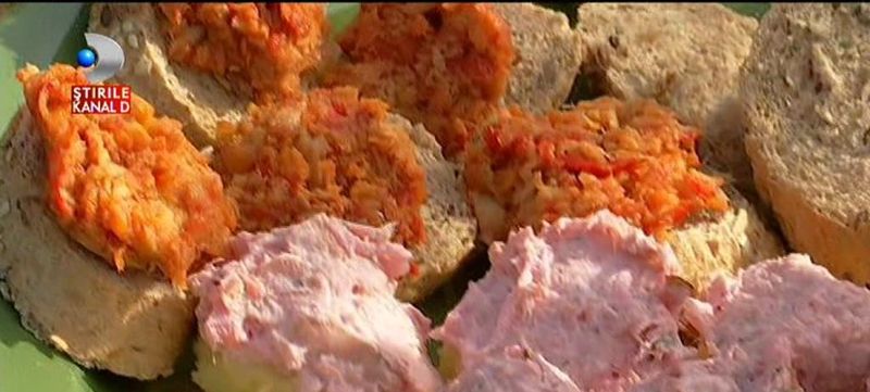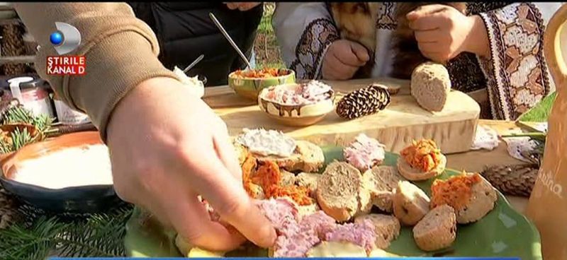 E pastrav afumat… Pastrav afumat, facut cu smanatana, marar, usturoi si sfecla. De-asta are si culoarea rozalie. M-ati nimerit. Eu sunt mare iubitor de mamaliga. De pastrava afumat, nu mai zic. Ne pare bine. Uite ca descopar niste arome noi.