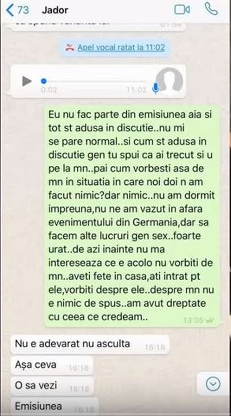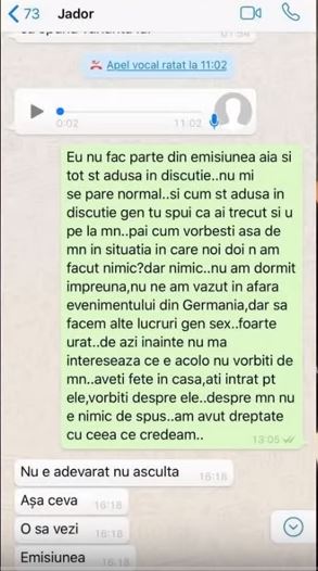 "Eu nu fac parte din emisiunea aia si tot sunt adusa in discutie... nu mi se pare normal... si cum st adusa in discutie gen tu spui ca ai trecut si tu pe la mine... pai cum vorbesti asa de min in situatia în care noi doi n-am facut nimic? dar nimic... nu am dormit impreuna, nu ne-am vazut în afara evenimentului din Germania, dar să facem alte lucruri gen sex... foarte urât... de azi inainte nu ma intereseaza ce e acolo nu vorbiti de mn... aveti fete in casa, ati intrat pt ele, vorbiti despre ele... despre mine nu e nimic de spus... am avut dreptate cu ceea ce credeam...", este mesajul Loredanei Chivu pentru Jador, făcut public, în exclusivitate, în vlog-ul făcut de Reea&Tina.