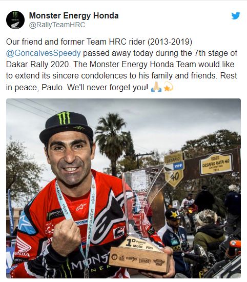 Paulo Goncalves a decedat în timpul cursei din cea de-a 7-a etapă a raliului Dakar. Anunțul a venit din partea Organizatorii Raliului Dakar 2020.
