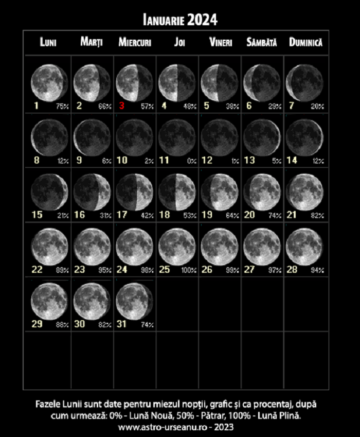 În diagrama de mai jos se poate vedea aspectul Lunii pentru fiecare zi a lunii ianuarie 2024.
