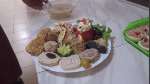 Cu doar câteva ore înainte de miezul nopții, bucătarii aranjează de zor tăvile cu bunătăți care ademenesc oaspeții mai repede la masă. Meniul e bogat: sarmalele în pâine cu coaste și cârnați, chifteluțele în crustă de migdale și balotina de porc sunt vedetele unui meniu regesc. Pe altă masă, așteaptă curcani cu copanele-n sus și porci bine rumeniți.