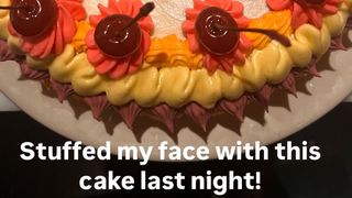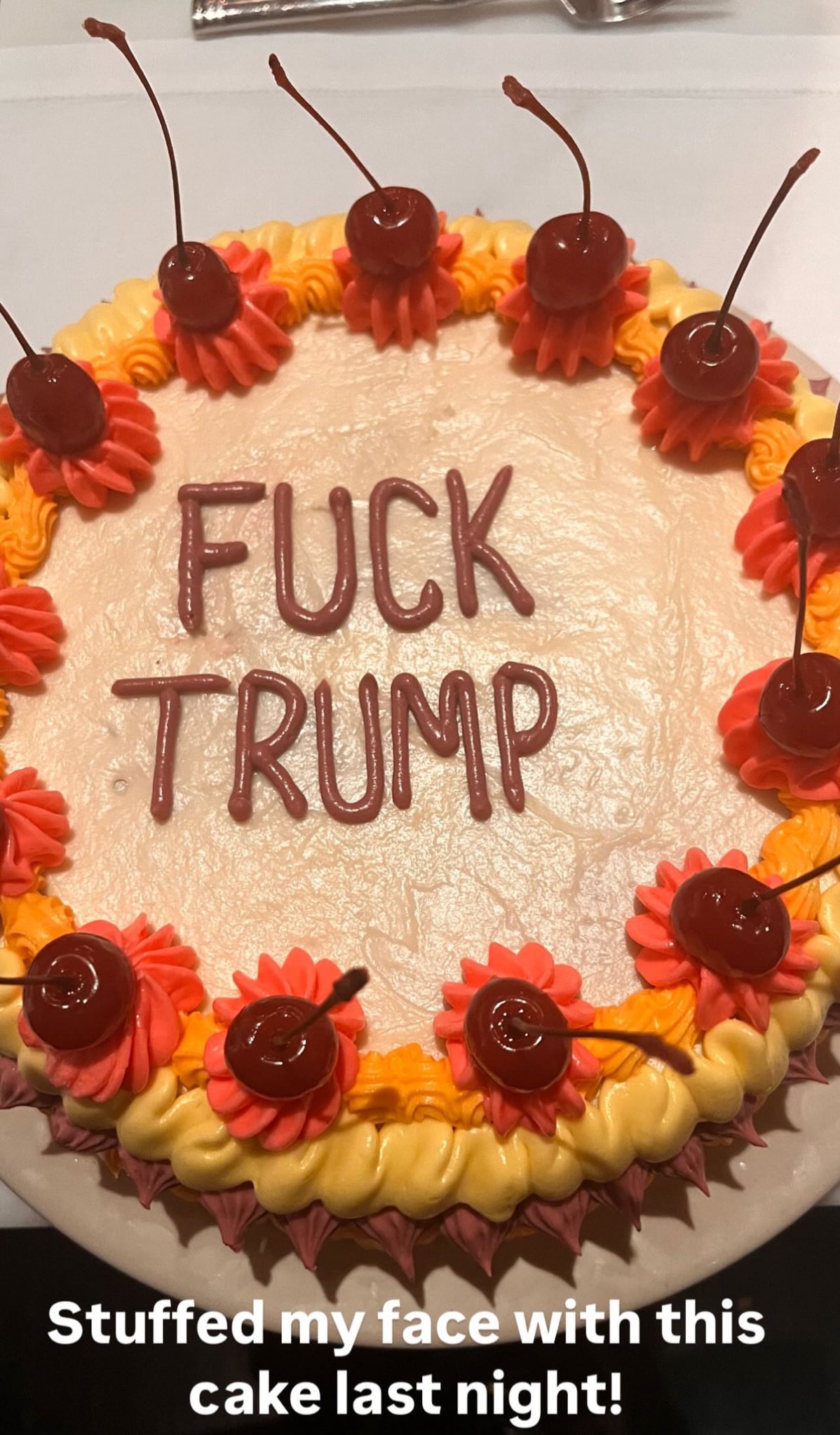 "Fuck Trump". În descrierea pozei, Madonna a scris să și-a băgat fața în tortul respectiv la aflarea rezultatelor alegerilor, când Trump a fost desemnat al 47-lea președinte al Statelor Unite ale Americii.
