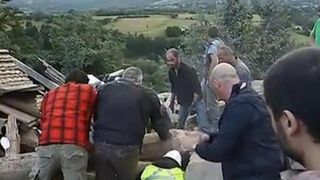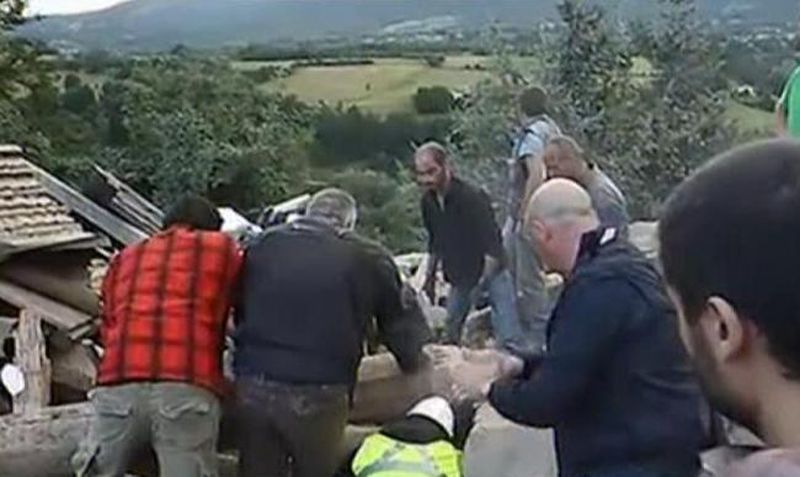 Dupa o munca titanica, mai multi barbati reusesc sa dea la o parte sarcofagul din beton, iar omul este scos, teafar si nevatamat, de sub daramaturi.