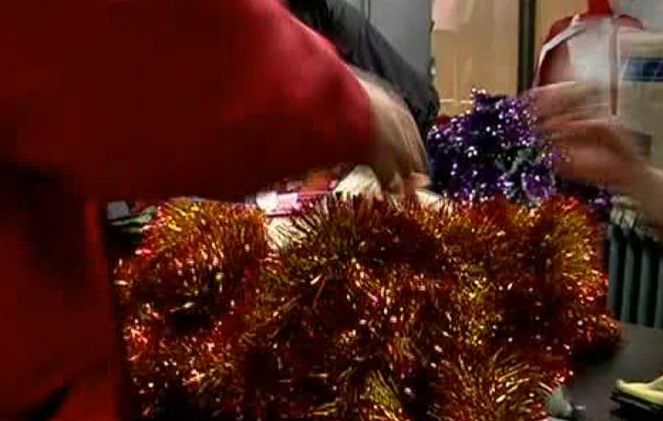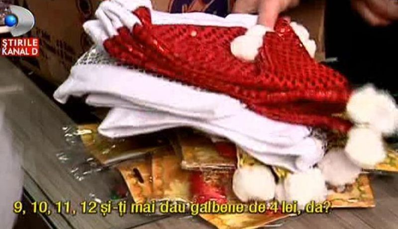 "Daca vreti sa va simtiti ca un brad de Craciun uman, sau aveti un alt pom pe care puteti sa il impodobiti, e de ajuns sa dati o tura pe aici, pe la magazinul bunurilor confiscate, unde cam totul graviteaza in jurul cifrei 1. Adica 1 leu, cel putin atat costa un fir urias de beteala, aceste caciulite la fel, tot cam la 1 leu.