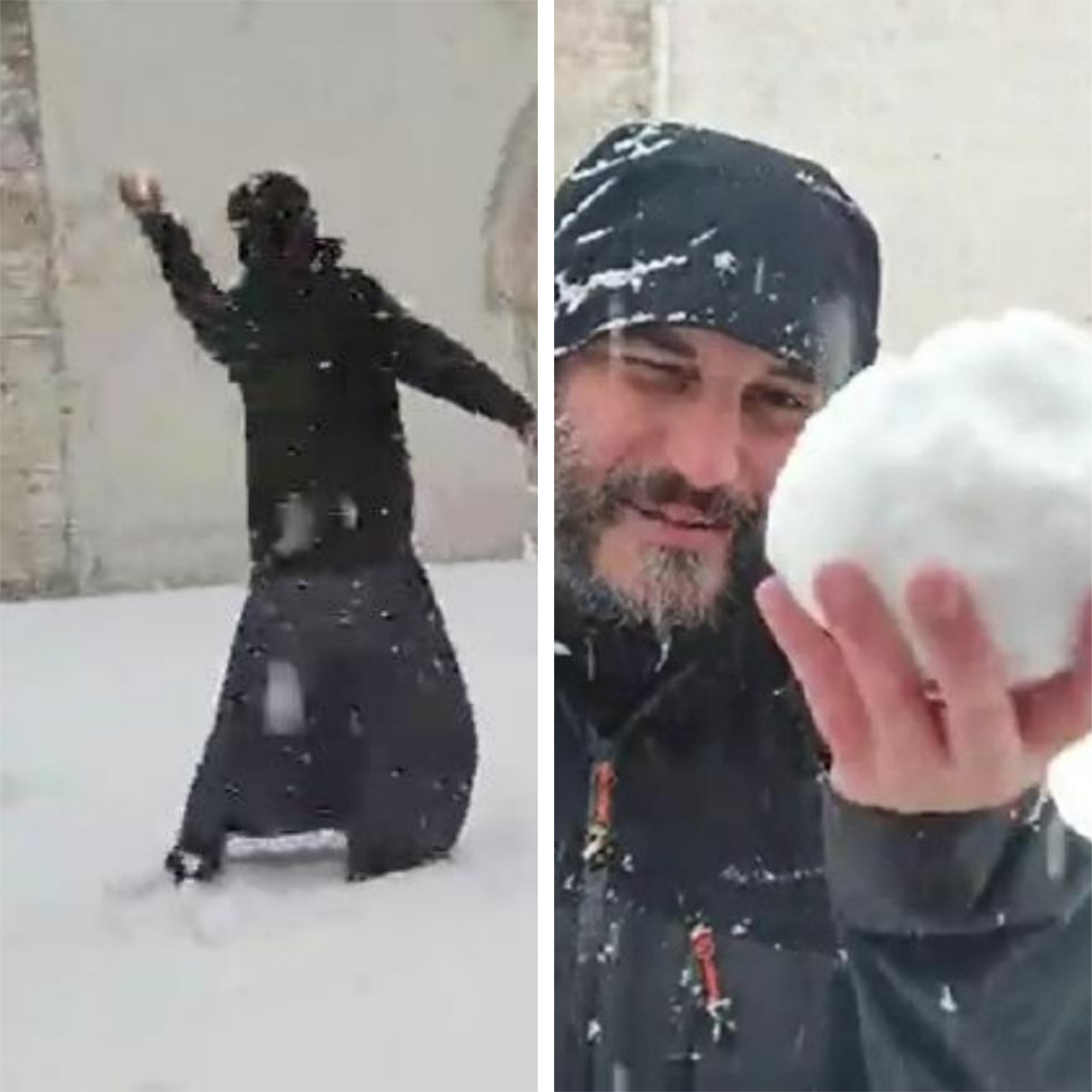 Aceștia au fost surprinși pe ritmul muzicii în timp ce aruncau bulgări unul către celălalt. În alte fotografii, călugării sunt surprinși și în timp ce fac oameni de zăpadă.