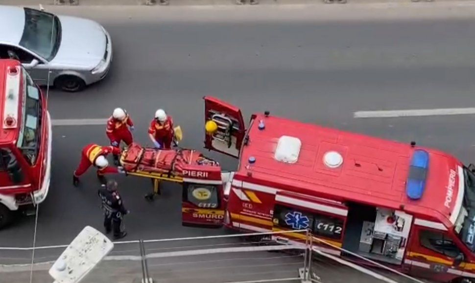 Pompierii au intervenit de urgență în urma accidentului din București. Cel puțin o persoană a fost scoasă din groapă cu targa de către salvatori.