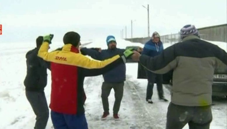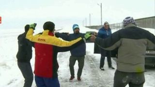 Romanul transforma drama in comedie cat ai bate din palme. Mai multi soferi care au ramas pe un drum inzapezit din judetul Constanta au incins o hora de-au topit omatul sub picioare. Oamenii au vrut sa mai uite de necazuri, asa ca au dat drumul la muzica de petrecere si au trecut la programul artistic. ##VIDEO43305##
