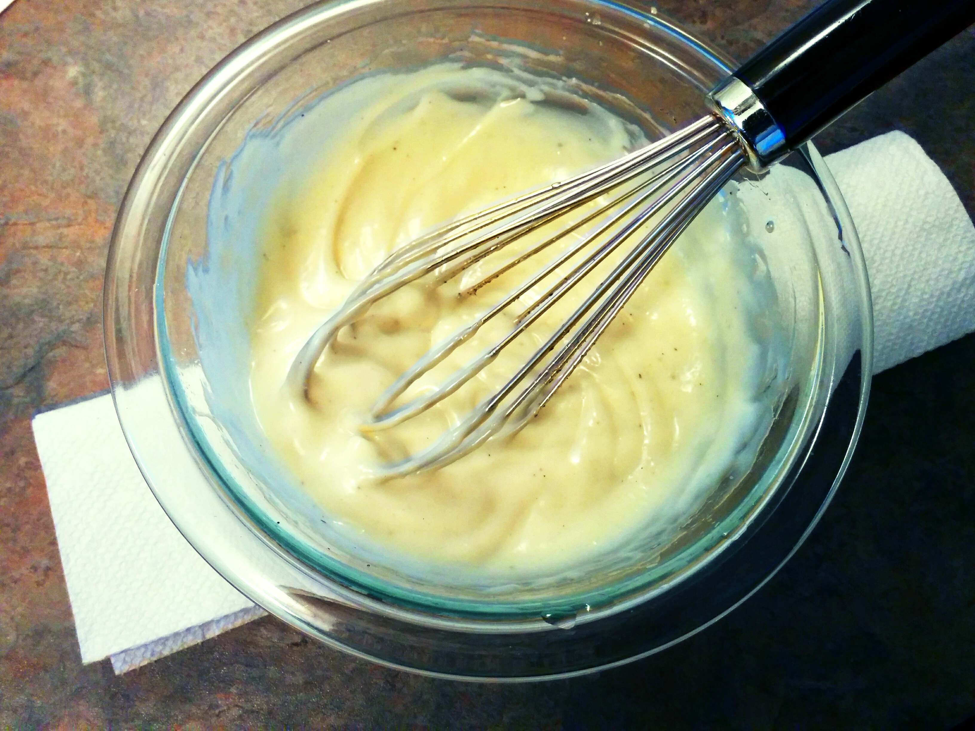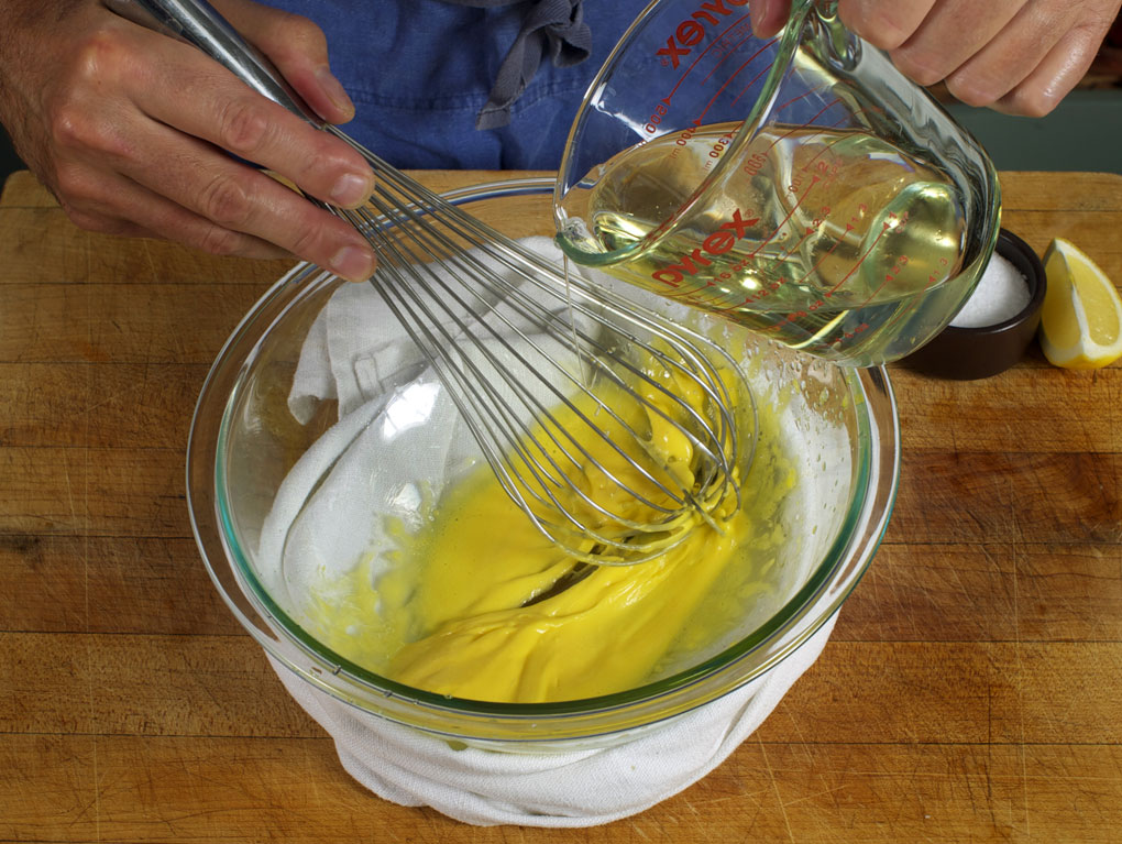 Adaugam mustarul si o lingura de ulei, amestecand in continuu.
