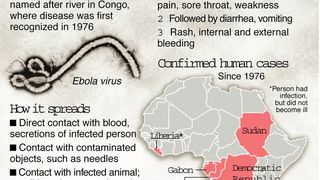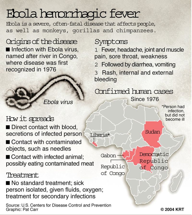 Ebola s-a manifestat pentru prima oară în 1976, în Yanbuku, Zair, în prezent Republica Democrată Congo, în apropierea unui râu cu numele Ebola. În numai două luni, febra hemoragică a lovit 318 persoane, dintre care numai 38 au scăpat cu viaţă. Ea s-a manifestat de atunci în Africa Centrală de 14 ori şi de fiecare dată cu dramatism: oamenii atinşi de Ebola încep să sângereze şi mor în chinuri groaznice. Epidemia dispare la fel de brusc cum a apărut, iar cei care scapă îşi duc cu greu viaţa mai departe, mai ales dacă şi-au văzut apropiaţii stingându-se în chinuri sub ochii lor. Omul nu este însă singurul "animal" vulnerabil la acţiunea virusului Ebola. Diverse alte specii de mamifere din regiunile centrale ale Africii sunt lipsite de apărare în faţa acestui agent patogen extrem de virulent. Maimuţele antropoide- cimpanzeii si gorilele-, cele mai apropiate rude ale noastre din regnul animal, sunt, ca şi oamenii, sensibile. De altfel, descoperirea unui număr mare de cadavre ale acestor maimuţe este, de obicei, un semn care anunţă izbucnirea epidemiilor. Şi alte specii de maimuţe, precum şi câteva ierbivore se pot îmbolnăvi de Ebola. Consumarea cărnii unor asemenea animale, importantă sursă de hrană pentru localnici, pare să fie una dintre căile prin care virusul se transmite.