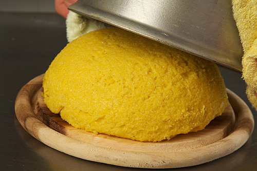 Apoi adaugati branza si restul de unt. Dati focul mic si continuati sa amestecati cu temei, mereu în aceeasi directie. Veti vedea mamaliga îngrosandu-se si desprinzandu-se de pe marginile ceaunului. Mamaliga ar trebui sa fie gata in 10-15 minute. Scuturati ceaunul si imediat rasturnati pe un platou cald. Taiati în felii si serviti fierbinte. Serviti mamaliga cu un preparat secundar pe baza de carne, peste sau oua, sau cu smantana.