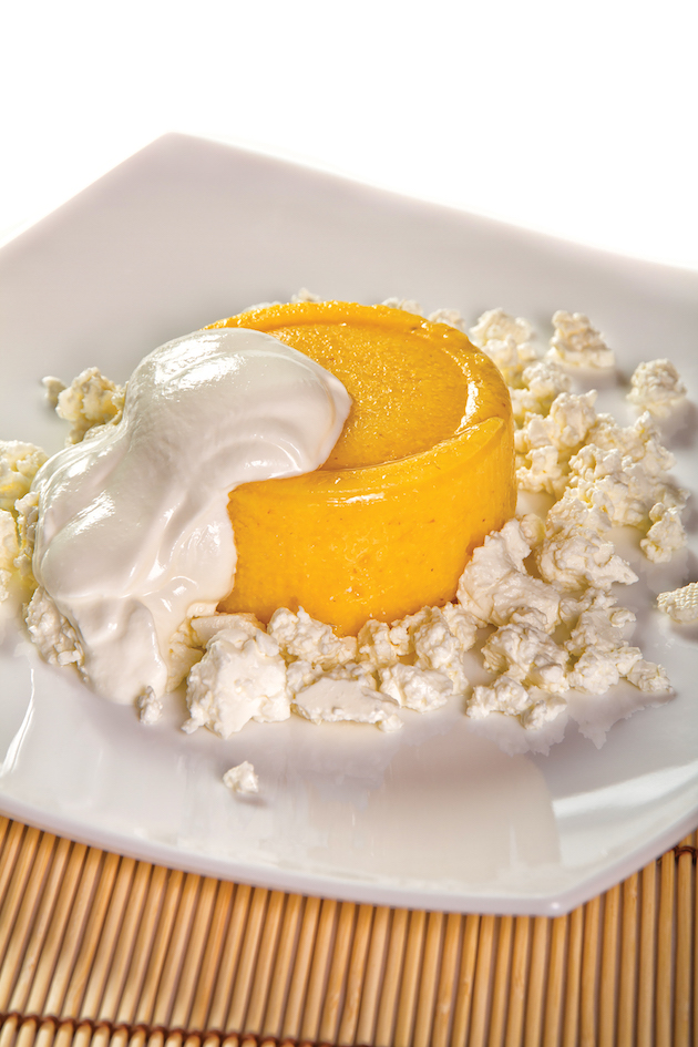 Răstoarnă mămăliga pe un platou şi, din loc în loc, înfige în ea câte o felie de brânză telemea.