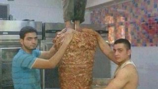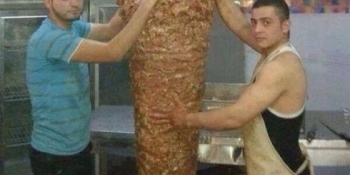 O imagine cu un shaormar care se urca cu picioarele pe carne a devenit virala pe internet. in fotografie apar trei angajati ai unei shaormerii care pun carnea pe suportul special.