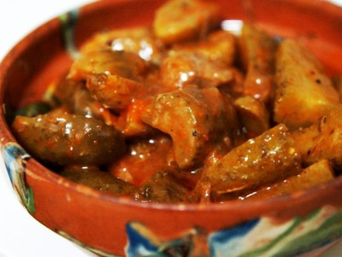 După ce se înmoaie, se toarnă sosul de roșii (acesta poate fi îngroșat cu 1-2 linguri de făină), cele 2 linguri de boia și cimbrul se mai lasă pe foc înca o jumătate de oră.
