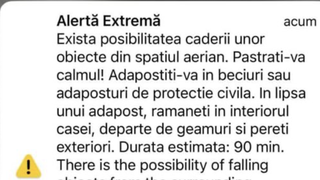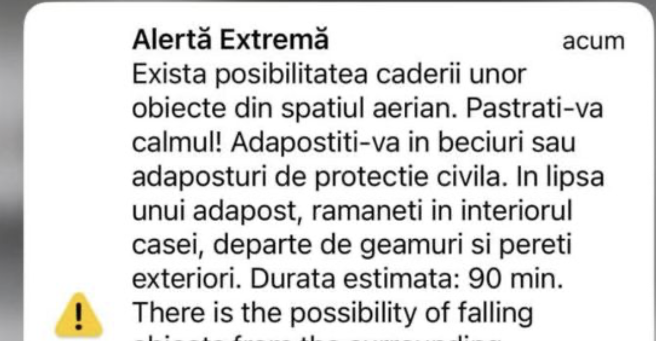 „Există posibilitatea căderii unor obiecte din spațiul aerian. Adăpostiți-vă în beciuri sau adăposturi de protecție civilă. În lipsa unui adăpost, rămâneți în interiorul casei, departe de geamuri și pereți exteriori. Durata estimată: 90 de minute“, este mesajul primit de locuitorii din cele trei județe.