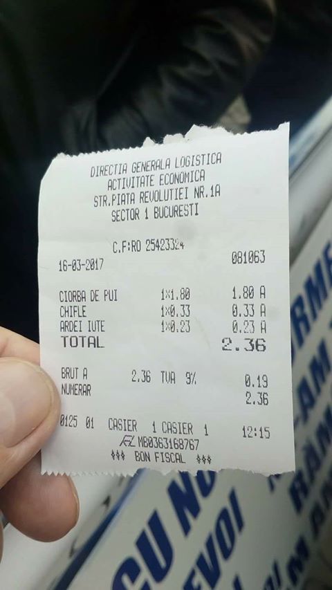 O ciorba, o chifla si un ardei iute la cantina MAI costa 2,36 lei, conform unui bon fiscal postat pe contul sau de Facebook de politistul Marian Godina, care sustine ca unii politisti care au participat la protestul de joi din fata sediului ministerului au intrat sa manance, insa ulterior nu li s-a mai permis si altora accesul.