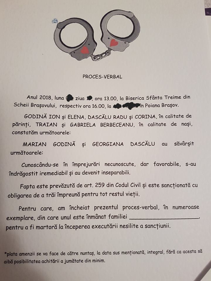 Marian Godina si Lorena Georgiana Dascalu sunt impreuna de cativa ani. Politistul si-a cerut iubita in casatorie la sfarsitul anului 2016, iar anul trecut, Godina a postat invitatia la nunta, ascunzand insa data la care va avea loc ceremonia religioasa. Invitatia arata ca un proces verbal si are o grafica originala: cu o pereche de catuse cu inimioare si un diamant.