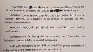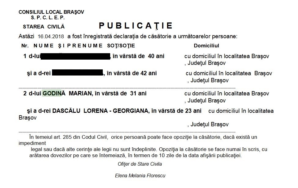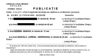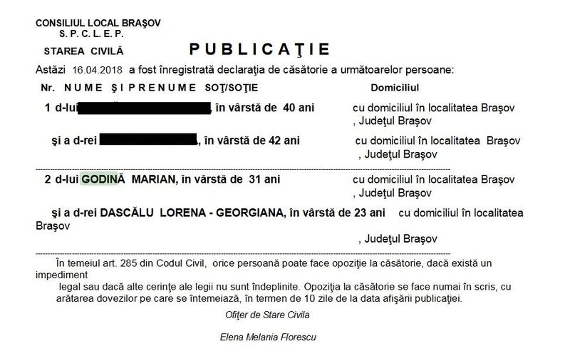 Conform unor documente de la Starea Civila Brasov, Marian Godina si Lorena Georgiana Dascalu au inregistrat o declaratie de casatorie pe data de 16 aprilie 2018. Cei doi s-au prezentat personal la sediul institutiei si au depus actele in vederea cununiei civile. Conform legii, Marian si iubita lui au avut la dispozitie cel mult 10 zile calendaristice pentru a-si oficializa relatia, incepand de la data la care au facut declaratia de casatorie. Acest termen expira astazi.