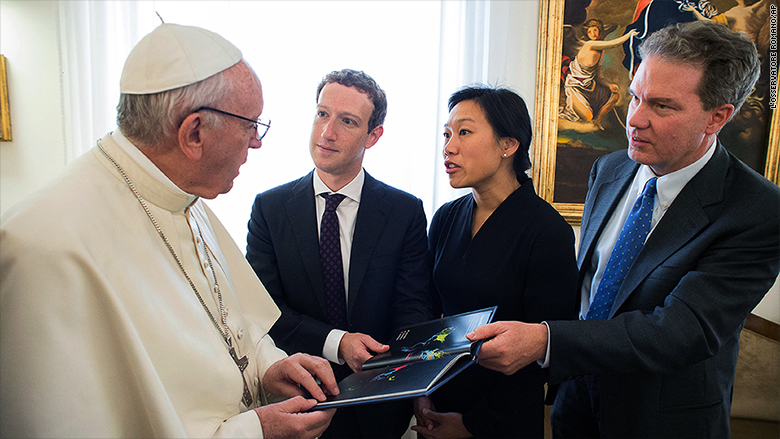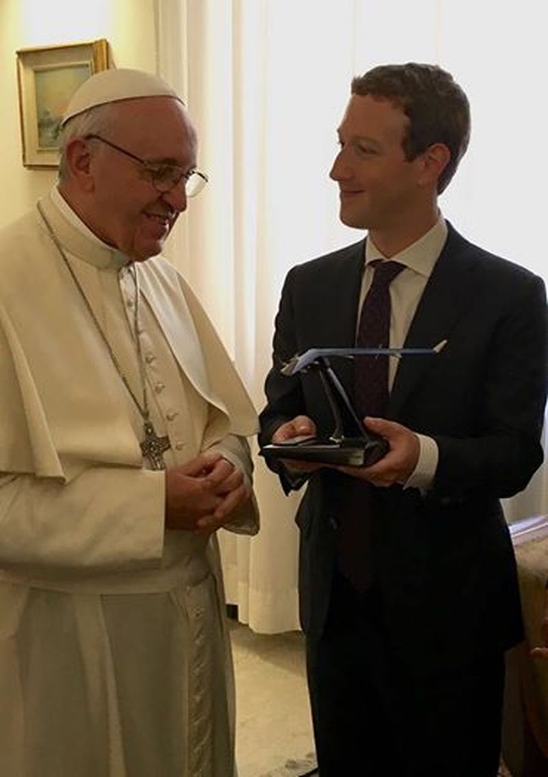 Mark Zuckerberg s-a intalnit luni 29 august cu Papa Francisc, in timpul vizitei sale la Roma. Fondatorul Facebook i-a facut cadou suveranului pontif o drona Aquila despre care Zuckerberg spune ca este modalitatea de a aduce internetul si in zonele izolate.