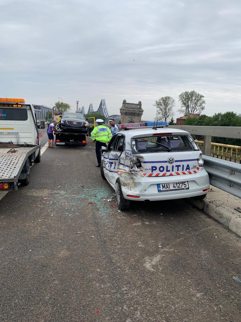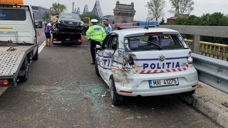 O mașină de poliție aflată pe banda de urgenţă a fost făcută praf pe podul de la Cernavodă. Traficul pe A2 este întrerupt din cauza accidentului în care au fost implicate „un autoturism şi un ansamblu de vehicule“ - după cum comunică Poliţia Română, care a trecut sub tăcere faptul că o maşină de Poliţie a fost făcută praf. Autospeciala se afla pe banda de urgenţă.