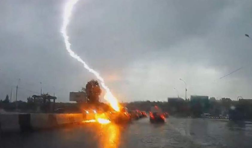 O mașină a fost trăznită de două ori de un fulger puternic, în timp ce se afla în trafic.