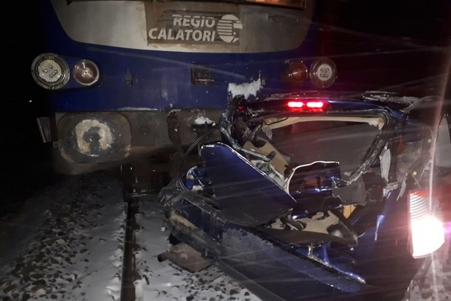 O mașină a fost lovită de un tren, la o trecere la nivel cu calea ferată de pe un drum județean, în localitatea Zimandu Nou din Arad.