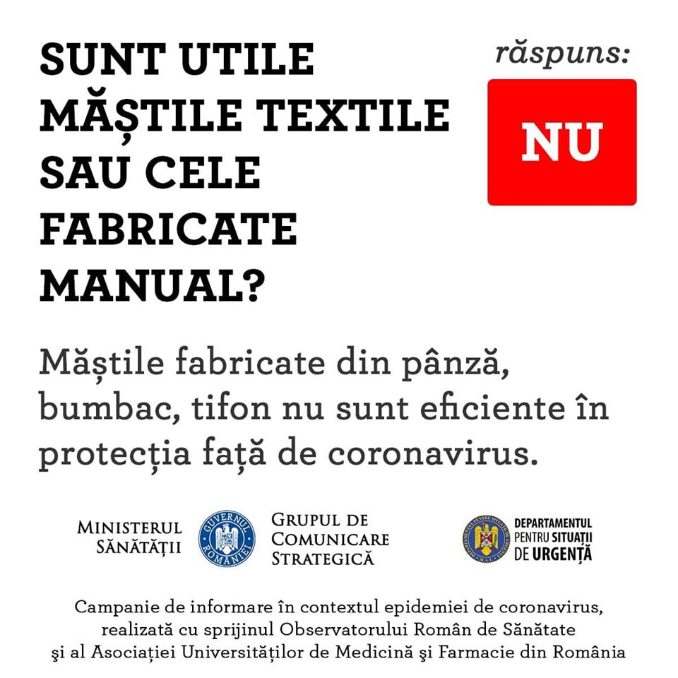 Din păcate, se vor fabrica măști care nu vor ajuta în pandemia de coronavirus. “Organizația Mondială a Sănătății și alte instituții internaționale de sănătate publică menționează foarte clar că măștile fabricate manual sau din pânză/bumbac/tifon nu protejează împotriva infecției cu coronavirus.”, au postat cei de la Inspectoratul General pentru Situații de Urgență. Presa a relatat că, odată cu răspândirea virusului COVID-19, a crescut dramatic cererea pentru măști chirugicale, ceea ce a dus la o criză a acestor măști în spitale și la creșteri formidabile de prețuri.
