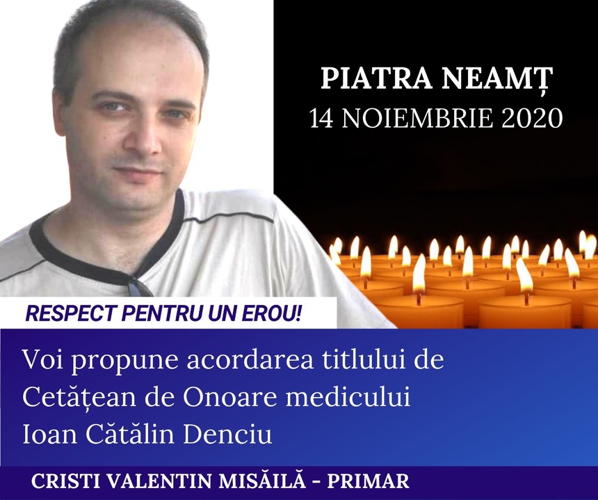 Primarul din Focşani, Cristi Valentin Misăilă, a anunţat că va propune acordarea titlului de Cetăţean de Onoare medicului Ioan Cătălin Denciu, rănit în timp ce salva pacienţi din incendiul de la Spitalul Judeţean Piatra Neamţ, în urma căruia 10 persoane au decedat. Edilul mai solicită premierului Ludovic Orban, ministrului Sănătăţii Nelu Tătaru şi ministrului Apărării Nicolae Ciucă să demareze, împreună cu Instituţia Prefectului Judeţului Vrancea şi DSP Vrancea, controale la spitalele din municipiul Focşani pentru verificarea stării aparaturii medicale.