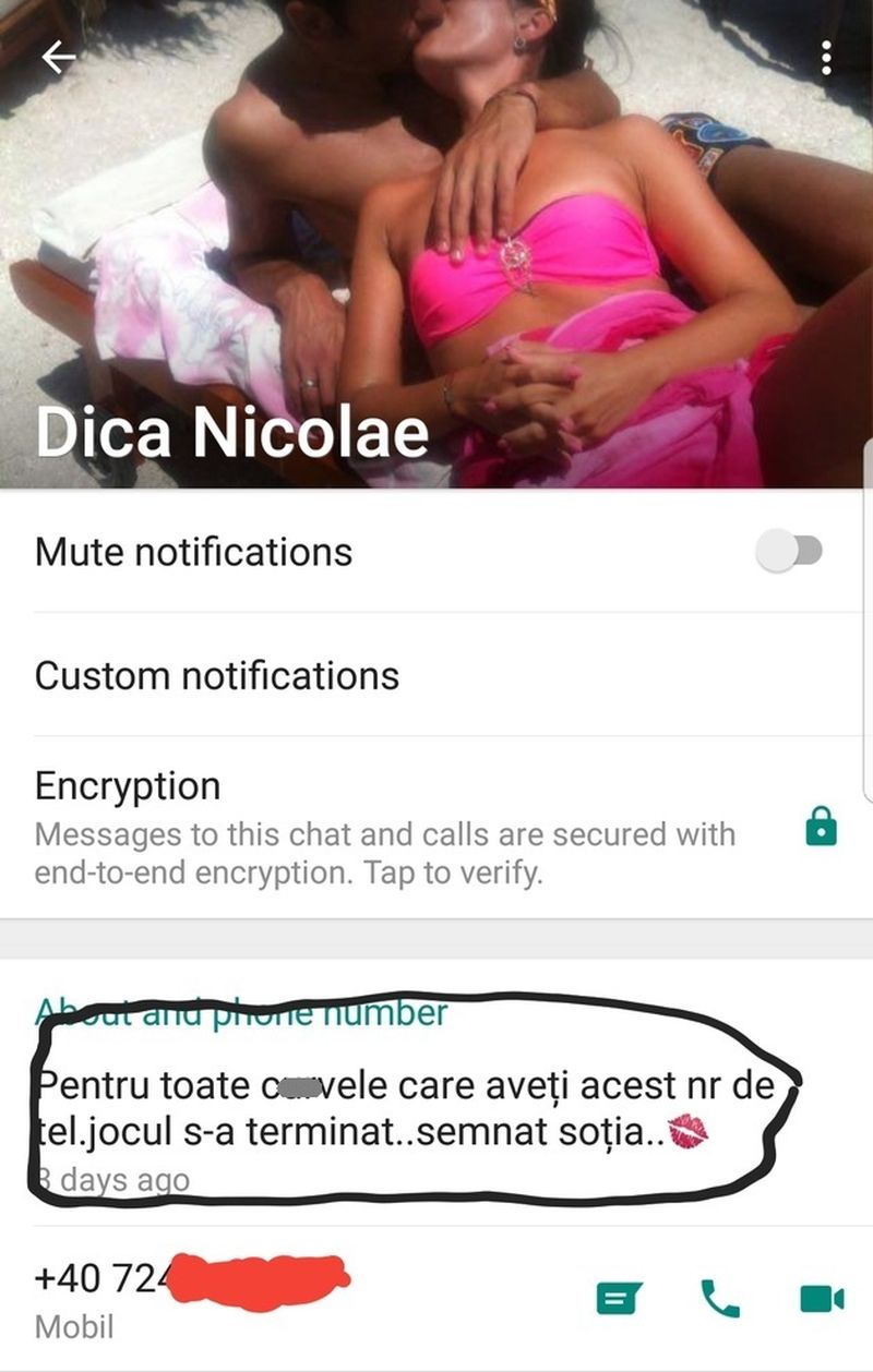 2 din 4 | Mesaj halucinant aparut pe contul de WhatsApp al lui Nicolae Dica: "Pentru toate c..vele care aveti acest numar de telefon. Jocul s-a terminat. Semnat, sotia!"