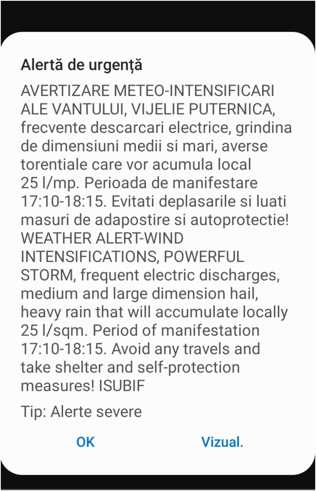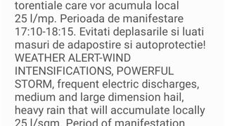 Autoritățile se așteptau la vijelie puternică, grindină de dimensiuni medii și mari, frecvente descărcări electrice, dar și averse torențiale care vor acumula peste 20...25 l/mp.
