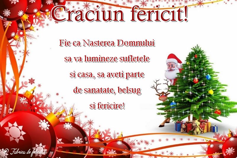 Moş Crăciun bate la uşă, Scoate mâna din mănuşă, Şi vă dă din palma lui, Darurile cerului. Lângă brad şi lângă foc, Să vă umple de noroc! CRĂCIUN FERICIT!