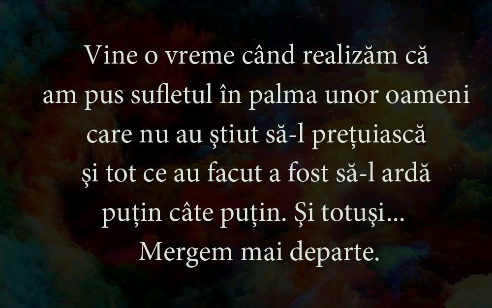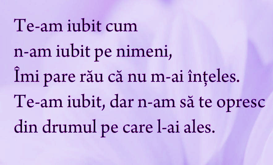 „Acum e gol în sufletul meu. Mi s-au spulberat toate visele, nu mă mai simt iubită. Plecând, o să privesc în jur, pentru că știu – cândva, am fost fericiți. Știu că te-am iubit și m-ai iubit. Acum însă, nu este nevoie să-mi vorbești cu supărare! Suspin de durere, dar vreau să ne despărțim frumos și să nu ne jignim. Sunt sigură că soarta ne-a pregătit ceva mai mult, mai bun, mai potrivit.