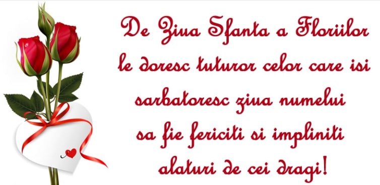 Flori frumoase să rasara-n calea ta, zile lungi şi fericire îţi doresc din partea mea. La mulţi ani de ziua numelui! Fiind o zi de sărbătoare creştinească, nu-mi vine decât să mă gândesc la Dumnezeu şi să-l rog să ocrotească familiile noastre şi pe cei dragi ai noştri, oriunde s-ar afla, şi să binecuvânteze vremurile şi lumea în care trăim. Motoceii să vă intre în casa cu mult belşug şi spor în toate!