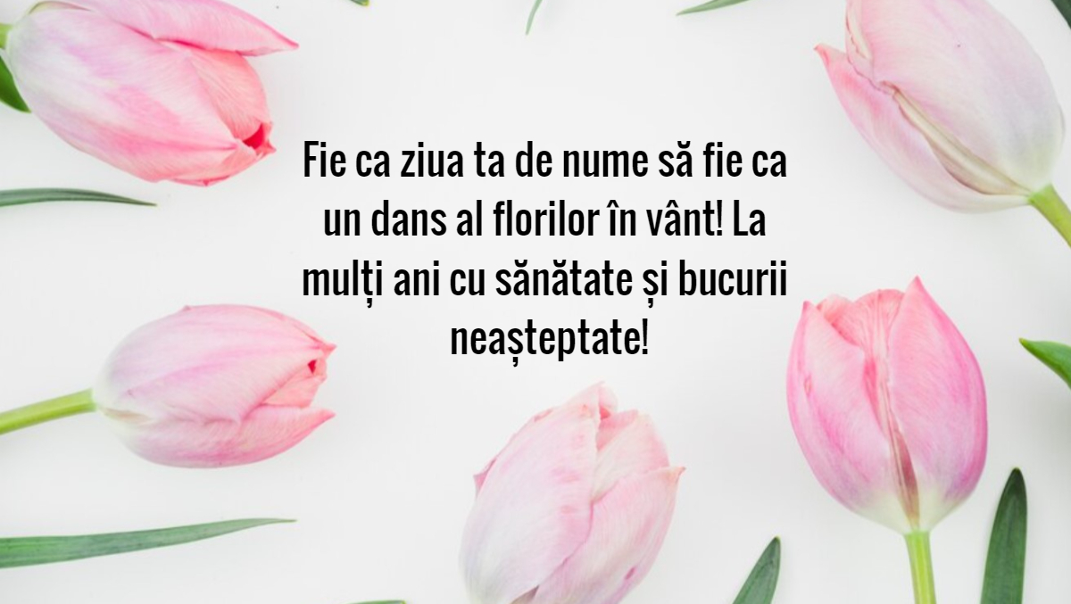 „Fie ca ziua numelui tău să fie la fel de frumoasă precum un dans al florilor în vânt, plină de armonie! Să ai parte întotdeauna de oameni iubitori și prieteni adevărați, iar bucuria, sănătatea, iubirea și bogățiile să fie mereu prezente în viața ta! La mulți ani frumoși!”