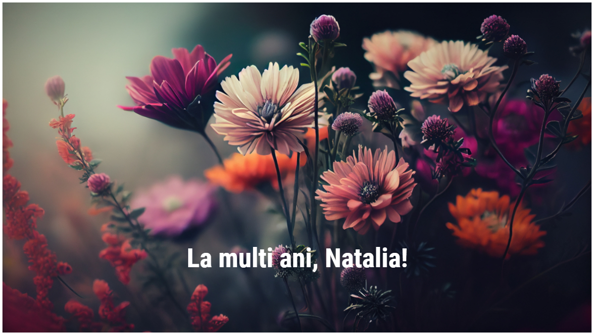 „La mulți ani, Natalia! Fie ca această zi să fie la fel de frumoasă și specială ca tine! Îți doresc să ai parte de multă iubire, sănătate și succes în tot ceea ce faci!”