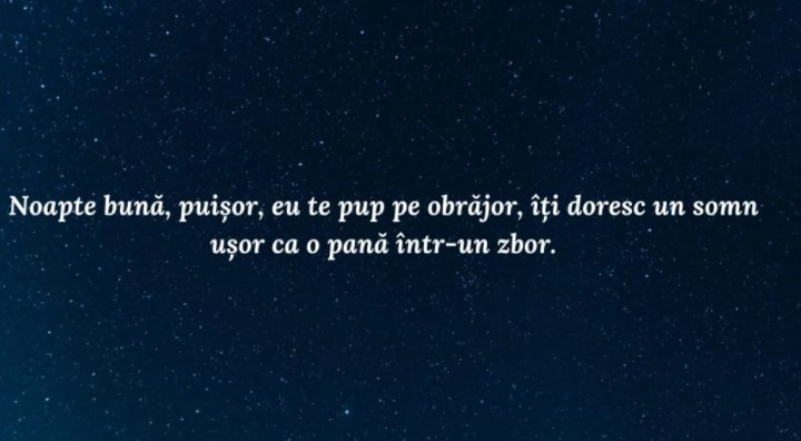 Să te așezi ușor în pat, pătura să te acopere ușor, iar somnul să îți fie liniștit. Noapte bună, draga mea!