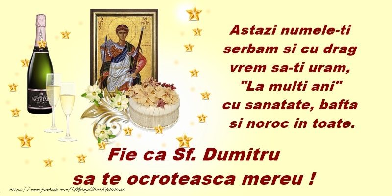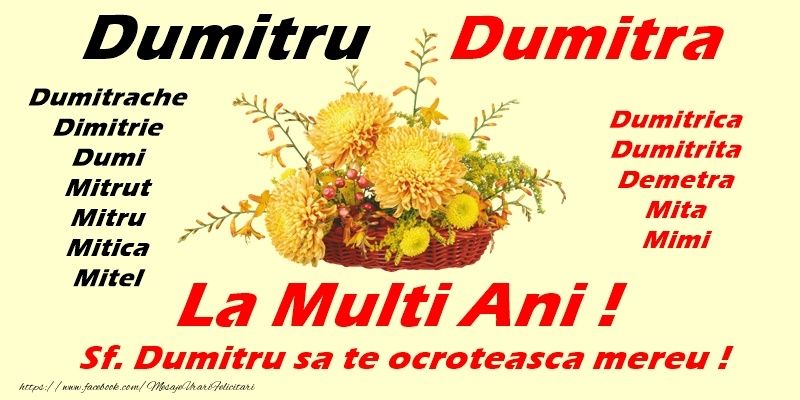 La Mulţi Ani, Dumitru!”„La mulţi ani de Sfântul Dumitru! Fie că toate împlinirile frumoase, sănătatea şi spiritul acestei zile să te însoţească pretutindeni. Îţi doresc o zi de Sf. Dumitru cât mai frumoasă!”