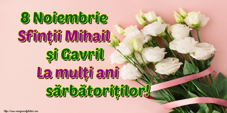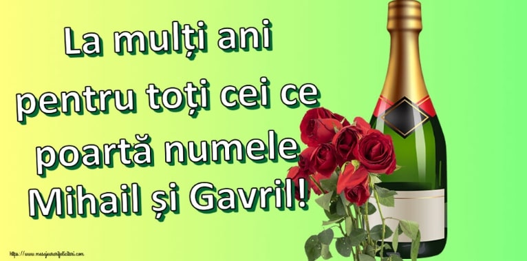 La mulţi ani Mihai/Mihaela!Azi fiind o mare sărbătoare, Sfinții Mihail și Gavril și ziua numelui tău, primește din partea mea multe urări de bine, fericire, mult noroc și împlinirea tuturor dorințelor!