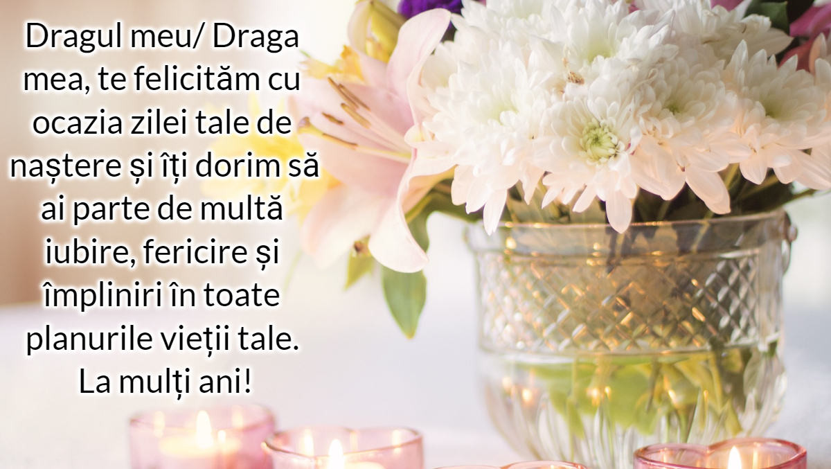 „Dragul meu/ Dragă mea, cu ocazia zilei tale de naștere îți doresc să ai parte de multe momente frumoase alături de cei dragi și de multe realizări în viitor! La mulți