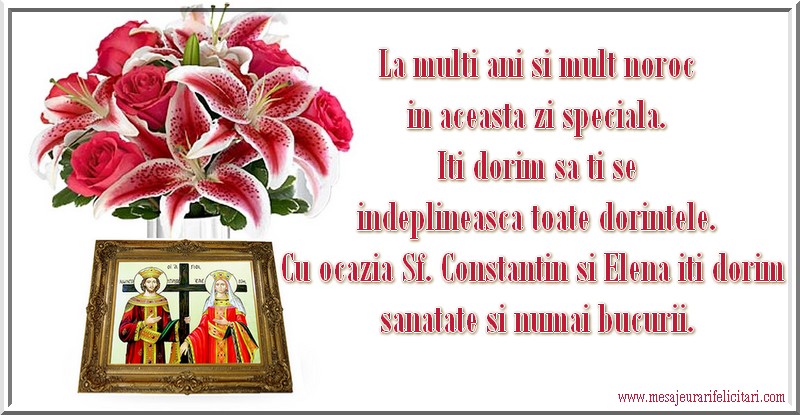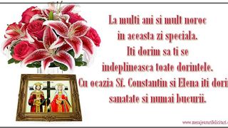 Fie ca toate împlinirile frumoase, sănătatea şi spiritul acestei zile să vă însotească pretutindeni. Va doresc o zi de Sf. Constantin şi Elena cât mai frumoasă!