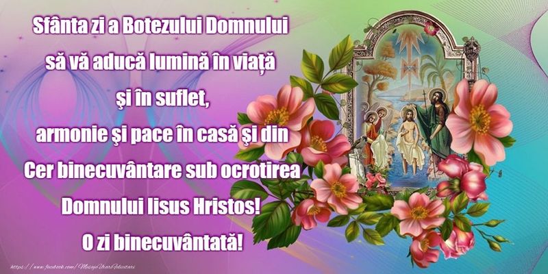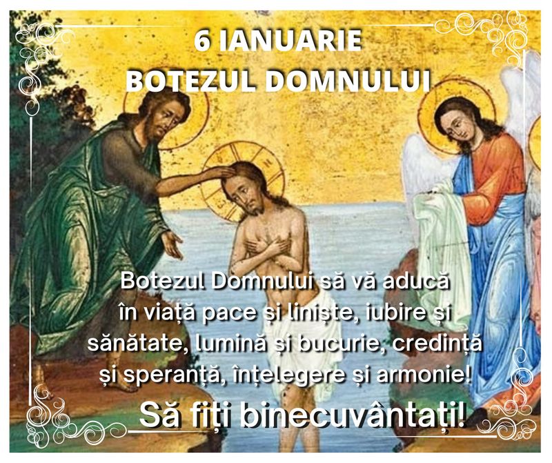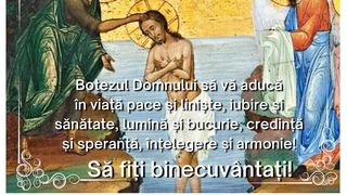 Cu prilejul sărbătorii botezului Domnului, vă doresc pace şi bucurie, pace şi mântuire, întru mulți şi fericiți ani! Apele sfințite toate, să vă aducă sănătate. În cale să vă spele ce este rău şi să rămână numai binele.