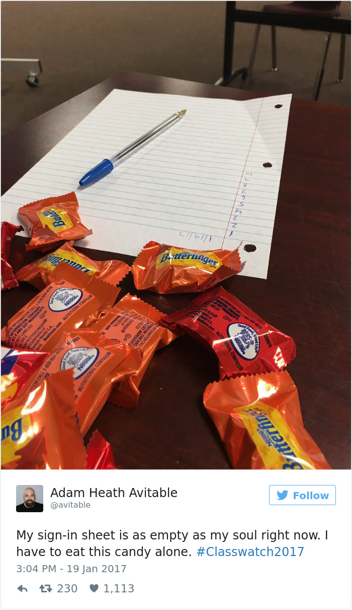 Ce face un profesor cand niciun elev nu vine la ore? Lasa mesaje pe Twitter. Cel putin asta a facut profesorul Adam Geath Avitable.