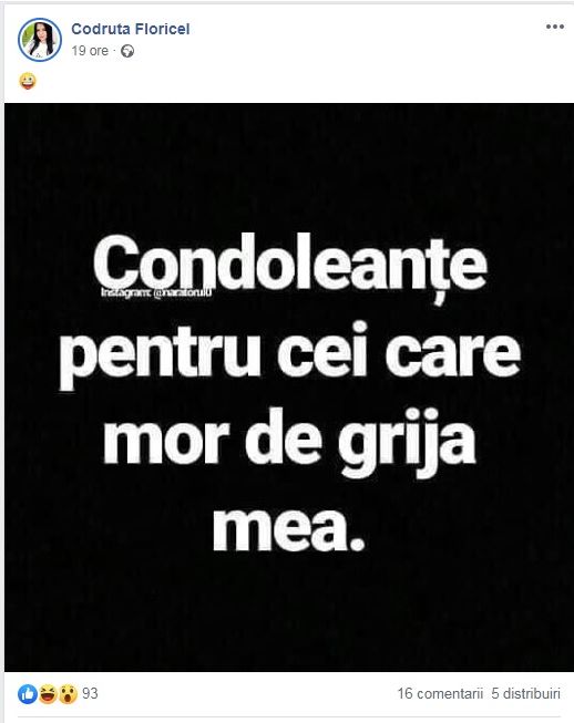 Codruţa Floricel a postat un mesaj la început de an, la trei săptămâni după funeraliile lui Cornel Galeş, care au avut loc pe 12 decembrie 2019. Fata de suflet a Ilenei Ciuculete a distribuit textul “ Condoleanţe pentru cei care mor de grija mea!”. ( vezi cine l-a acuzat pe Cornel Galeş că a bătut-o pe Ileana Ciuculete înainte de nuntă)