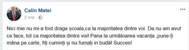 PSD-istul le spune copiilor ca nici ei nu au incotro, trebuie sa mearga la ore, iar pana la urmatoarea vacanta ii indeamna sa puna totusi mana pe carte si sa nu fumeze “in buda”, scrie b1.ro.