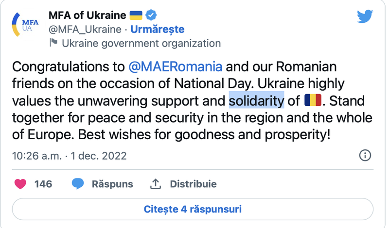 „Felicitări MAE din România și prietenilor noștri români cu ocazia Zilei Naționale. Ucraina prețuiește mult sprijinul ferm și solidaritatea României. Stați uniți pentru pace și securitate în regiune și în întreaga Europă. Cele mai bune urări de bunătate și prosperitate!”, arată mesajul Ministerului ucrainean de Afaceri Externe.
