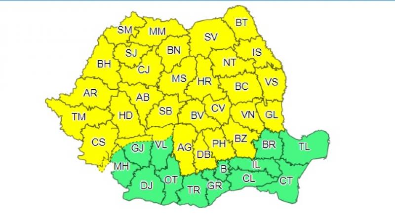 De la ora 10.00, până marți dimineață la ora aceeași oră, va fi în vigoare un cod galben de vreme instabilă. Acesta vizează zonele de deal şi de munte, precum şi în Banat, Crişana, Maramureş, Transilvania şi în Moldova, unde vor fi descărcări electrice, ploi torenţiale, grindină şi vijelii. Cantităţile de apă vor depăşi arii restrânse 40- 60 l/mp, au anunțat reprezentanții ANM.